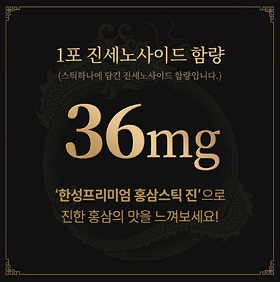 한성인삼 프리미엄 제품은 1포당 진세노사이드 36mg을 함유하고 있어, 기능성과 품질 면에서 매우 우수한 프리미엄 홍삼 제품으로 자신 있게 소개할 수 있습니다.